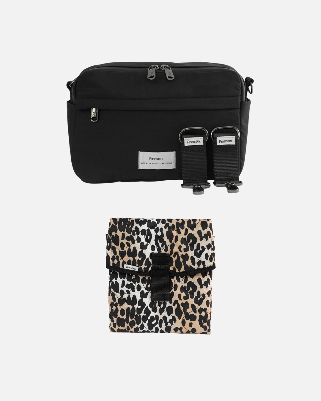 Meet the ultimate eco-friendly parenting bundle featuring the FRIDA Eco Stroller Organiser in Black and the KARI Eco Changing Mat in Leopard. The Frida stroller organiser is the perfect companion for a busy lifestyle, with universal stroller clips and water-repellent, machine washable material made from 100% recycled PET Polyester. The luxurious Kari changing mat offers comfort and convenience on the go, with extra padding and slim pockets for nappies. Made from the same eco-friendly material, this bundle is designed to make parenting a breeze while caring for the environment.