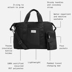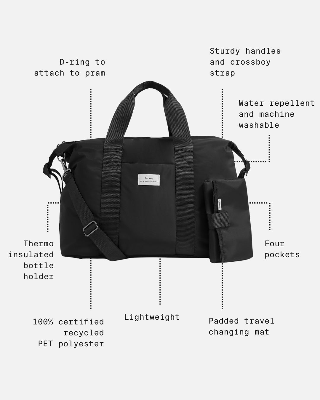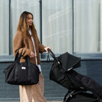 The essential multitasker Ida holdall changing bag is the perfect unisex, lightweight holdall designed for weekends away, a hospital stay or even a trip to the gym. Ida is also perfect for everyday use as a larger changing bag, durable and versatile with ample storage for you and baby. It features sturdy handles plus hands-free wearability with the crossbody strap. Available in classic black, the Ida Changing bag is made from 100% certified recycled PET Polyester which is water repellent and machine washable. The light grey interior allows you to quickly locate items. Also includes a padded travel changing mat in black.